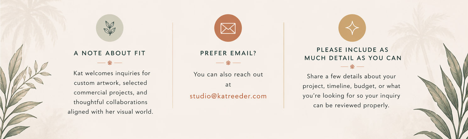 Interested in a custom piece, collaboration, licensing opportunity, or something else? Use the form below and share a few details. Kat reviews inquiries personally and will respond as soon as possible.