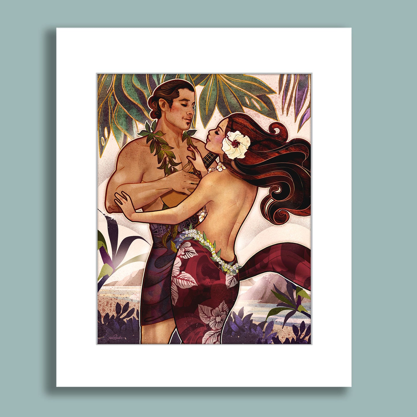 Celebrate love in paradise with this tender portrait of a Hawaiian couple mid-dance. With graceful movement and lush surroundings, this print is a romantic homage to island passion.