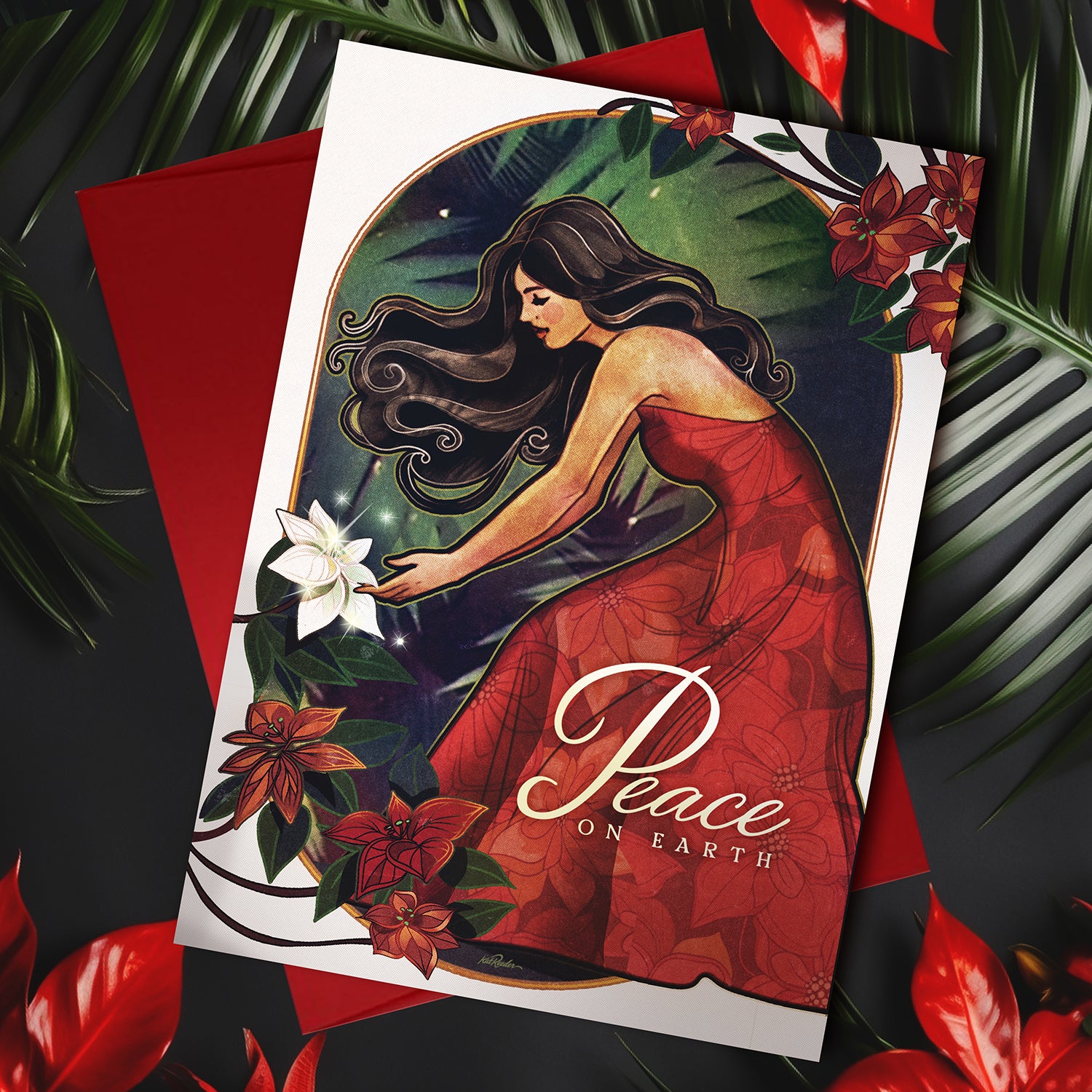 The Peace on Earth greeting card features Kat Reeder’s lush Tropical Nouveau artwork—bold botanicals, warm island tones, and a festive vibe that feels like Christmas in paradise.