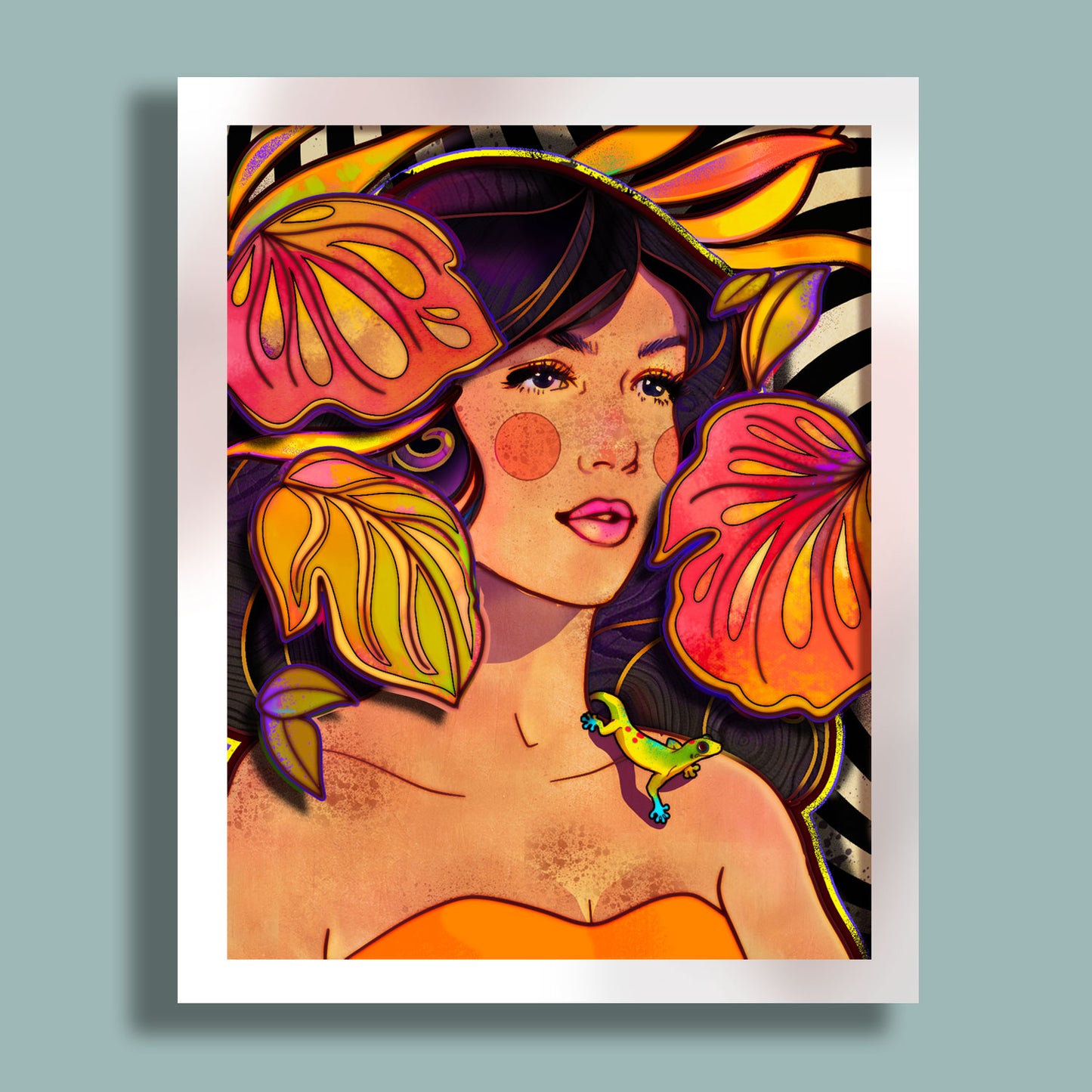 A sultry tropical beauty crowned with vibrant leaves and a watchful gecko. This shadow box art fuses retro flair, nature, and bold femininity with depth and dimension. Made with aloha and a bit of psychedelic magic.